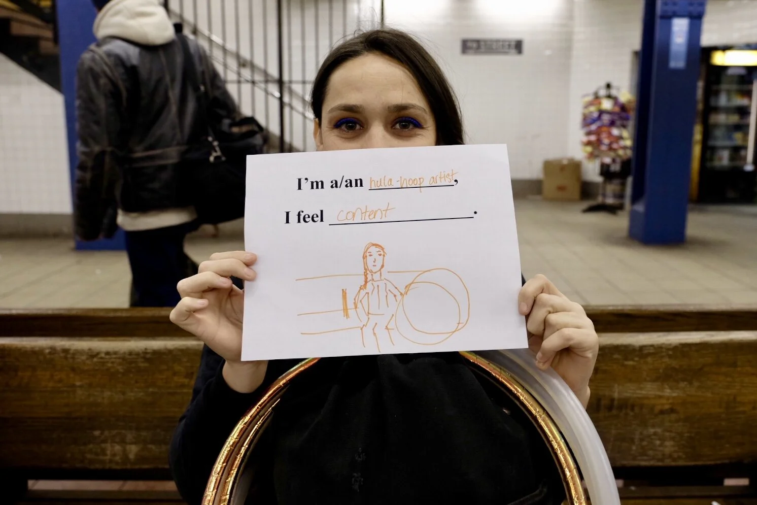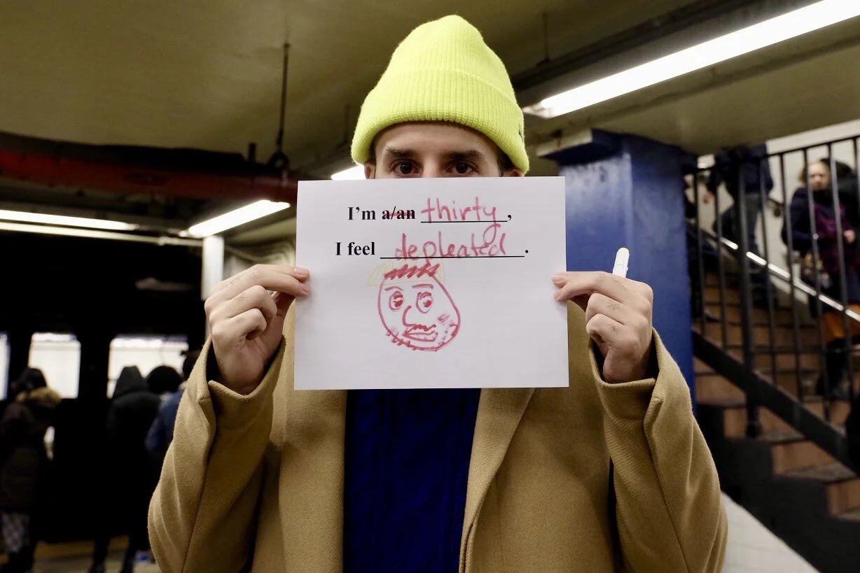 In this project, I designed the following sentence for passengers waiting for the subway to fill in: "I am a/an __________, I feel ____________." I also asked them to use one of the color pens I provided—red, orange, yellow, green, or blue—to draw a self-portrait. For sample diversity, I didn't only ask people who look "friendly" or "easy-going," I picked my aims randomly. But it also formed a certain resistance to complete the project. I remember one time, before asking a hobo, I felt that he might ask me to go away. Actually, before I got close to him, he yelled at me, "F ** k off!" Also, a few of the passengers doubted if I want to beg some money from them.