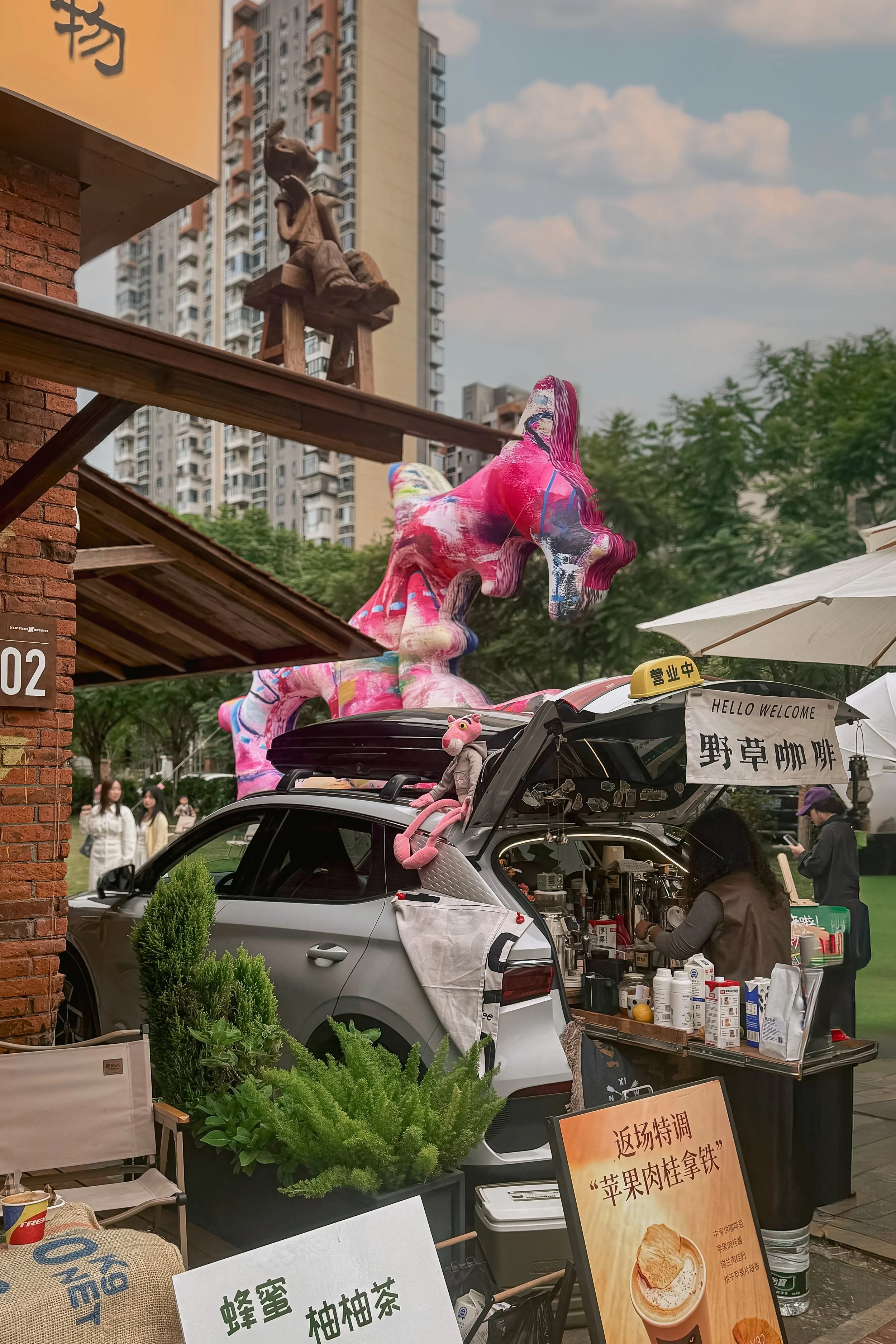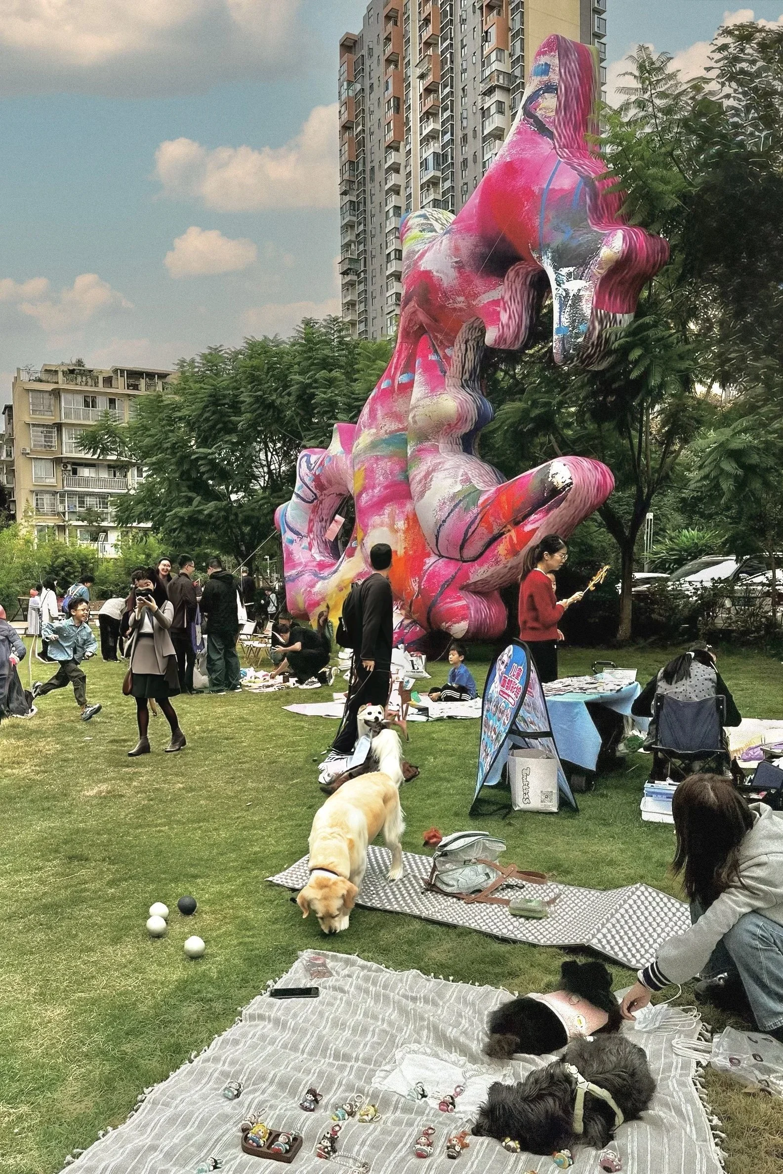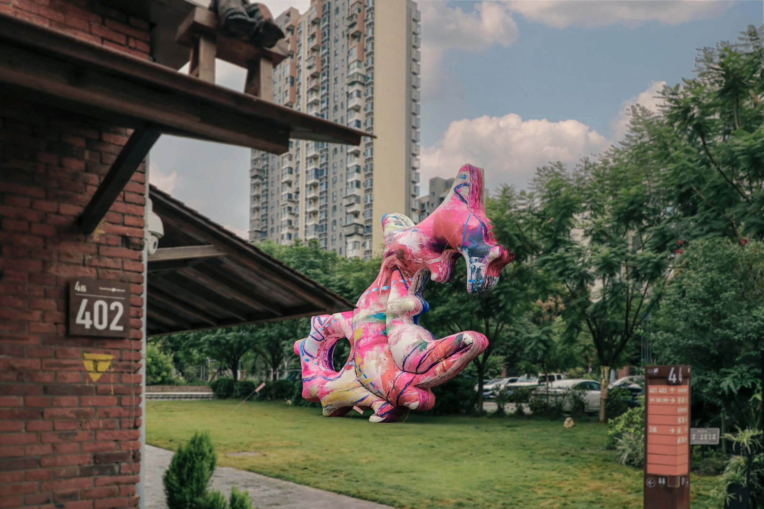 Installed on the central lawn, Pyrodrake quickly became a visual landmark of the festival. The sculpture extends Wushuang’s painterly language into a dynamic three-dimensional form, translating her gestural marks, saturated colors, and rhythmic abstractions into an immersive spatial presence. Its creature-like morphology, simultaneously playful and otherworldly, invites viewers to circulate around it, photograph it, and encounter it from shifting perspectives. Within the context of a community market and a historically rich industrial site, Pyrodrake bridges contemporary artistic imagination with collective public experience—bringing color, movement, and a sense of wonder to the evolving cultural landscape of the district.